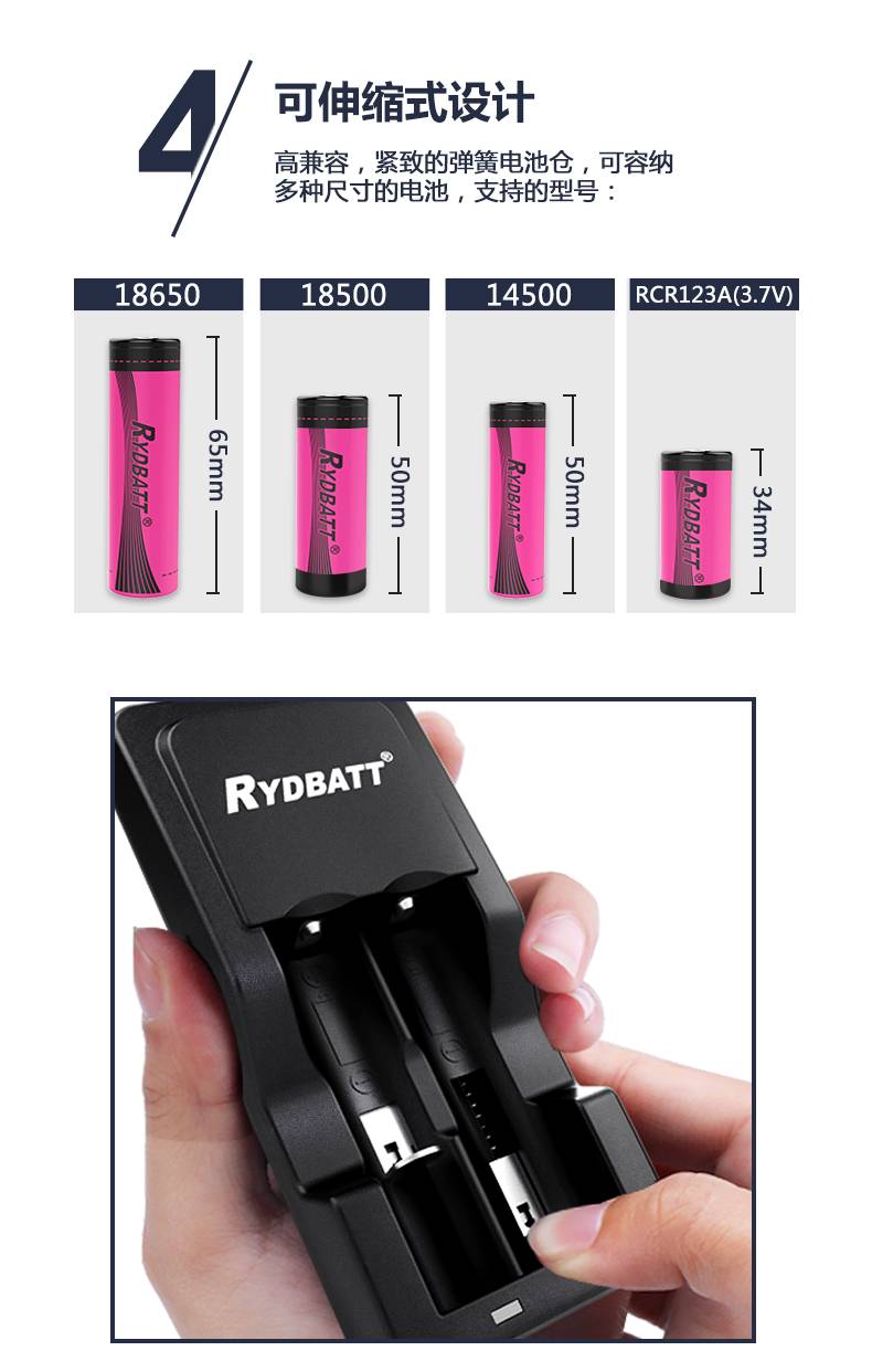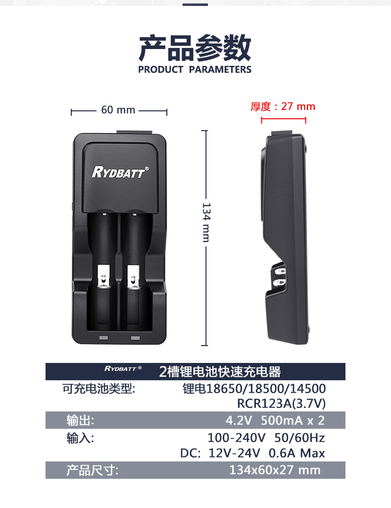 产品描述:CH-RLi223-01/JBC023-11 AC DC2槽4.2V0.5A锂离子充电器,滑槽设计,可兼容多个规格的锂电池充电使用,此充电器仅支持4.2V的锂电池充电使用。
