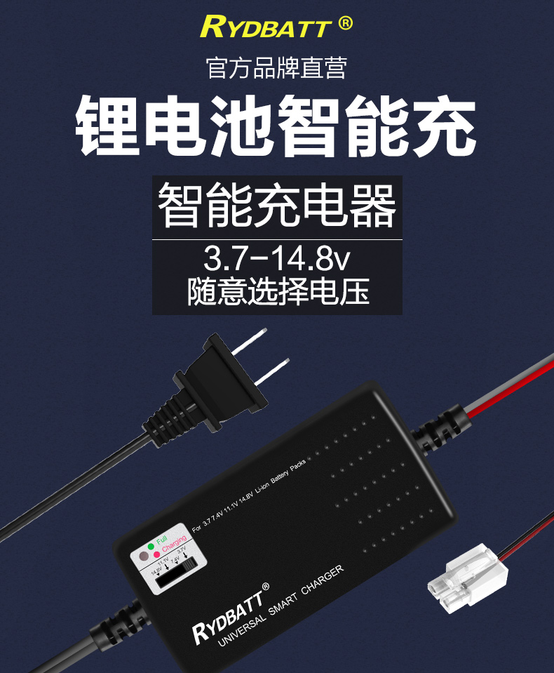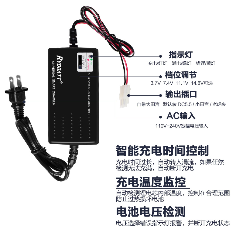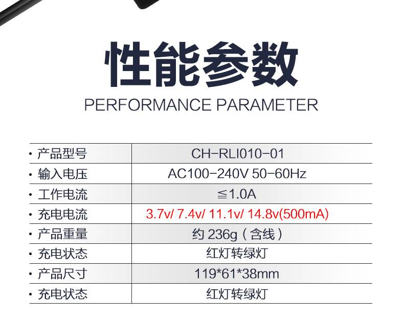 产品描述:CH-Rli030-01/JLC006-01-011-4串 3.7V 7.4V 11.1V 14.8V锂电池充电器是一款可选择电压的锂电池充电器,用途广泛,高标准工艺,符合CB/CCC/UL等国家和地区的环保认证标准。安全可靠