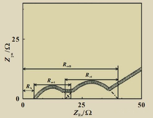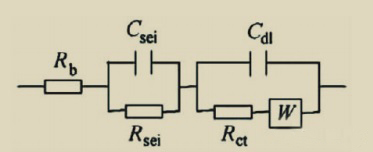 与阻抗谱中各频率阻抗成分相对应,Rb表示欧姆电阻;Rsei和Csei表示SEI膜的电阻和电容,与高频部分的半圆对应;Rct和Cdl分别代表电荷传递电阻和电双层电容,与中频部分半圆对应;W为Warburg阻抗,即锂离子在电极材料中的扩散阻抗,在复平面上用与实轴呈 45°的直线表示。