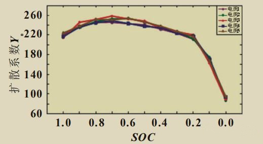 欧姆阻抗几乎不随SOC变化,但是电荷传递阻抗在充电和放电时却有很大的不同。充电深度加大,电荷传递阻抗降低,0.1~0.2SOC区间的变化最为明显,如图3所示。放电时,电解质活性物质的消耗导致电荷传递阻抗增大,低SOC时陡然上升。对于扩散阻抗,充电过程与放电过程变化规律都是高SOC区间和低SOC区间的值较小,中间SOC区间的值比较大。但是放电到10%SOC以下时,扩散系数迅速减小,如图4所示。扩散阻抗与扩散系数成反比,因而扩散阻抗大幅度增加。