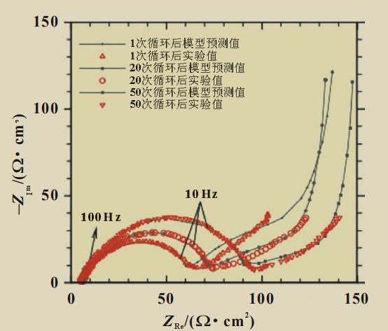图6 1次、20次和50次循环下模型阻抗和实验阻抗