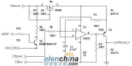 本文选用了三极管Q1来替代文献[2]中的MOSFET,首要是因为MOSFET的开启电压一般都在2.5V以上,因而当单体电池电压低于2.5V时,文献[2]中的电路将无法检测,而电池的电压检测规模要求检测到1V以下,而改善后的电路能满意这种需求,如图1所示。