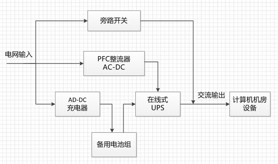 当电网电压正常时候,DC-AC 的工作电源是由电网电压输入到 PFC 整流器获得的,然后逆变输出,供给计算机机房。