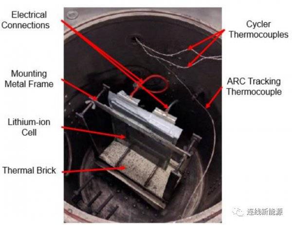 如表1所示,实验所用电池为15个Ah LMO-NMC混合正极的软包电池。电池正常电压范围为2.7-4.2V。电池在弧绝热热仪上进行绝热过充,如图1所示。在过充测试中,电池没有被夹住。过充试验的截止条件为电池电压达到7.9V。