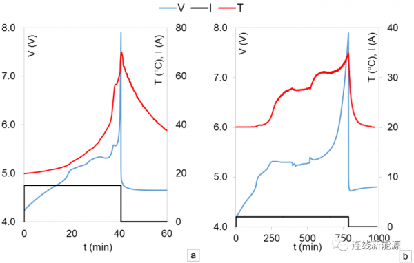 如图2所示,在室温下电池电压达到7.9 v的过度充电约40分钟1 C,而大约需要750分钟的电池电压达到7.9 v室温超过收费在0.13摄氏度,和750分钟/ 40分钟= 18.75 > 0.13 1 C / C = 7.69,表明超载比例对电池过度充电行为有重要影响,影响并不是一个简单的线性关系。从电池表面温度来看,1 C过充的电池表面温度最高为70℃,0.13 C过充的电池表面温度最高不超过40℃,电池不失去对热量的控制。另外值得注意的是,无论是1C过充电还是0.13C过充电,电池电压都是先上升,然后在5.0V附近出现类似的平台,最后电压迅速上升到7.9V截止。超载过程中考虑到当前值是恒定的,作者认为,平台面积约5.0 v的综合结果内部阻力的增加,锂电池短路引起的天然气生产肿胀,而随后的快速步电压7.9 v的结果严重电池气体生产和内部阻力显著增加的主要因素。