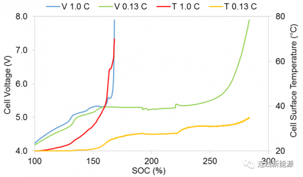 如图3所示,将SOC绘制出来,当SOC为160%时,1 C过充电池的截止状态达到7.9V,而0.13C过充电池的截止状态在SOC约为270%时达到。与图2相似,过充电电流越大,电池电压和表面温度上升越明显,并不是简单的线性关系。鉴于目前传统的NCM软包电池1c过充容易出现热失控,上述测试结果也表明,最终的过充测试结果不仅取决于充电比率,还取决于电池的化学系统、尺寸和容量等。