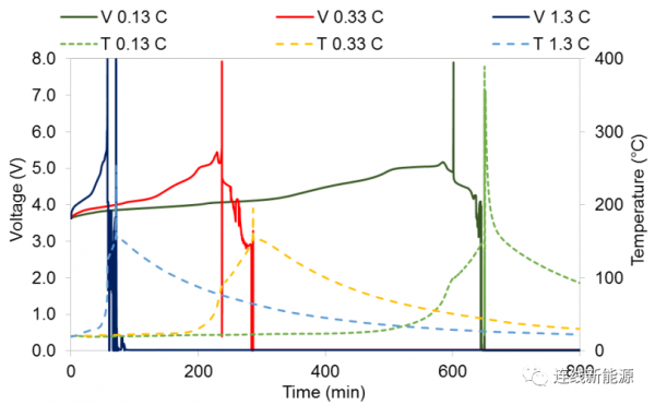 与常温过充不同的是,绝热过充电池内部产生的热量不能完全释放,电池的积热更为严重。如表2所示,图5,1.3度和0.33度和0.13 C过度充电电池电压为7.9 V截止时间分别58分钟,237分钟和602分钟,虽然不同于过度充电的时间很接近三个额外的能力(19日至20日啊),电池SOC SOC近230%失败,电池过度充电温度非线性有明显的差异。另外,在常温过充情况下,0.13C和1 c过充电池都只会膨胀而不失去热量控制,但在绝热过充情况下,0.33C和1 c过充电池都起火了,而0.13C过充电池则会破裂。这也说明,与常温过充相比,绝热过充的测试条件更加苛刻,电池更容易发生热失控。