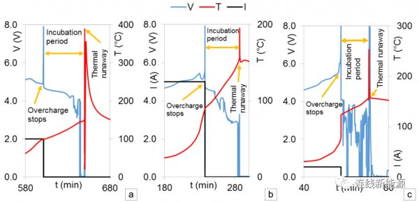 图6。不同电池比下的绝热过充结果比较:(a) 0.13c;(b) 0.33摄氏度;(c) 1.3摄氏度。