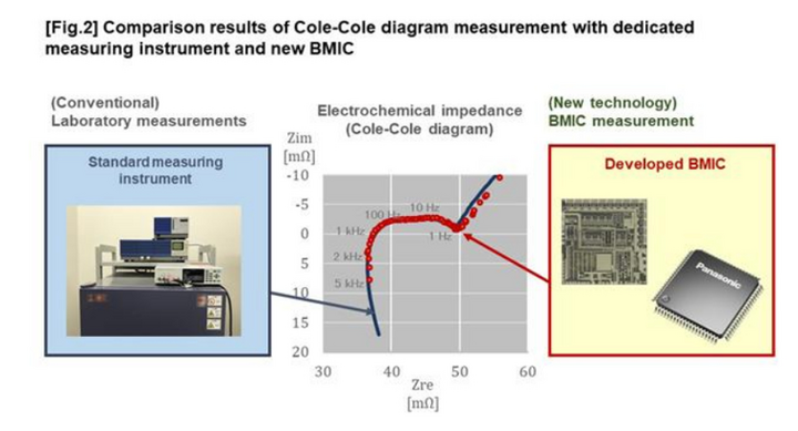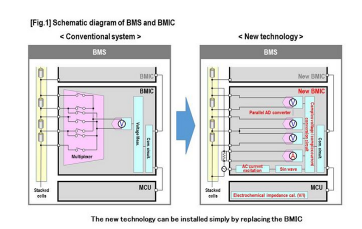 除了传统功用,新开发的BMIC测验芯片还内置电化学阻抗测试能力,运用交流电励磁法进行测试。电化学阻抗测量是经过15个彻底并联模拟的数字转换器、0.1 Hz到5khz的脉冲调制交流电励磁电路,以及内置在BMIC中的复数电压/复数电流转换电路来完成的。因而,不需要对现在电池中的BMS装备进行重大调整,BMIC芯片就能够在电池运行状态下测量出电池的电化学阻抗。