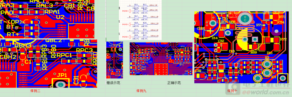 三,1,运放输入端的匹配电阻距离芯片引脚应小于2cm(参见样例二),并且两组电阻不能分开(参加样例九)。