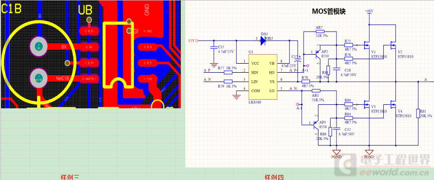 2,运放输入端的匹配电阻连接到相应MOS管源极和漏极(或采样电阻两端)的引线应走差分线,不可以就近选择系统地线(参见样例十)。